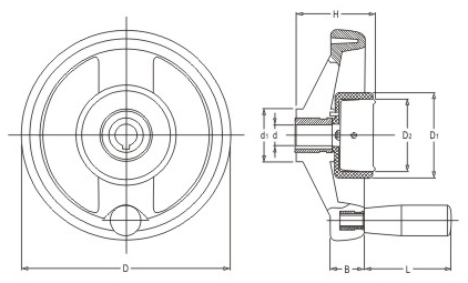 JS.105006 雙輻表盤手輪 顏色:黑色 材質:酚醛樹脂(膠木)、鋁合金 用途:適用于木工、食品、包裝、印刷等機械的精密指示或讀數(shù)調節(jié) 特性:外形美觀、堅固耐用、機械式結構、