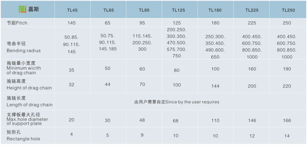 JS.106005 TL型鋼制拖鏈 Tl系列拖鏈的主體是由鏈板(優(yōu)質(zhì)鋼板鍍鉻)支撐板(擠拉鋁合金)軸銷(合金鋼)等部件組成,使電纜或橡膠管與拖鏈之間不產(chǎn)生相對(duì)運(yùn)動(dòng),不產(chǎn)生扭曲變形,鏈板經(jīng)鍍鉻處理外形效果新穎,結(jié)構(gòu)合理,靈巧強(qiáng)度高,鋼性好不變形,安裝方便,使用可靠,易拆裝,尤其是本產(chǎn)品采用了高強(qiáng)度耐磨材料,合金銅為軸銷,提高了產(chǎn)品的耐磨強(qiáng)度,彎曲更靈活,阻力更小,降低了噪音,從而可保證長(zhǎng)時(shí)間使用不變形,不下垂。 由于本產(chǎn)品外觀精美,可在較大程度上增強(qiáng)機(jī)床設(shè)備的整體藝術(shù)美觀效果,增強(qiáng)我國(guó)機(jī)床、機(jī)械設(shè)備在市場(chǎng)的競(jìng)爭(zhēng)能力。 1.拖鏈可適應(yīng)移動(dòng)速度40米/分。 2.拖鏈在移動(dòng)速度時(shí),噪聲聲壓級(jí)不大于68分貝。 3.拖鏈安全使用壽命不小于100萬次(往復(fù))。
