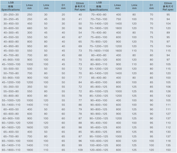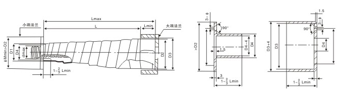 D1-保護套小端內(nèi)徑=dmaz+10毫米 D2-保護套大端內(nèi)徑 D3-大端法蘭內(nèi)徑=D2+6~8毫米 D4-小端法蘭外徑=D1-1~2毫米 dmax-被保護零件的較大直徑 Lmin-較小壓縮長度 Lmax-較大延伸長度 L-較大允許行程