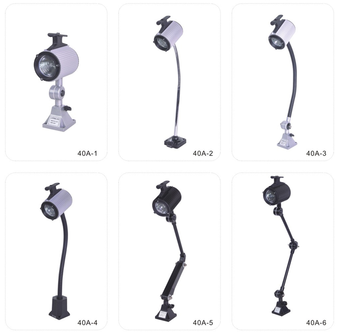 JS.109001 40A系列工作燈 40A-1工作燈采用新光源鹵鎢燈泡,光線柔和,聚光性好,適用各中小型機(jī)床,數(shù)控機(jī)床,鉆銑床、組合機(jī)床及其它設(shè)備的照明,并具有防水、防爆、防侵蝕等優(yōu)點(diǎn)。 40A-2、-3、-4工作燈底座350°旋轉(zhuǎn),照射角度可任意選擇,聚光效果好。